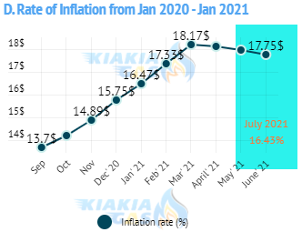 Inflation Rate and the LPG: Over the last 13 months, the rate of inflation has been steadily increasing. However it reached its highest point In March 2021 (18.17%), before it started decreases in the last three months. It fell from 18.12 to 17.93 in May to 17.75% in June 2021. (Fig D). From 12.8 in July 2020, to 13.2 in August 2020. The composite food index reduced from 22.95 in March 2021 to 22.72 in April 2021, 20.57 in January 2021, 19.56 in December 2020, 15.48 percent in July 2020 compared to 15.18 percent in June 2020. The anticipated inflation rate for the month of May is 15.4%. The relax of Covid-19 rule might contribute to the change in the rate of inflation trend.