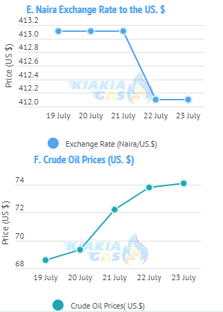 Exchange Rate and the LPG: In line with widening discrepancies in the parallel market, the Central Bank of Nigeria's (CBN) have adjusted the exchange rate (Figure E). Movement in the exchange rate along the same line was maintained at 413.11/US$1 up till the middle of the week but fell towards the end of the week. One of the factors that influences the price of LPG on the international market is the exchange rate. Since more LPG is imported, a lower exchange rate has little impact on the selling price of LPG on the local market.