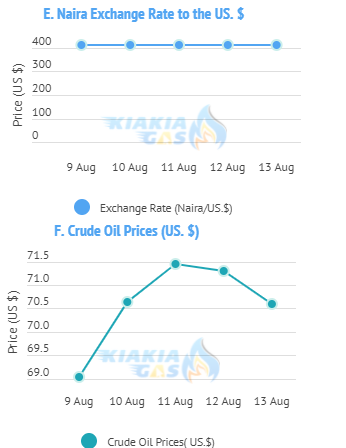 Exchange Rate and the LPG: In line with widening discrepancies in the parallel market, the Central Bank of Nigeria's (CBN) pegged the exchange rate to fine tune the forex market. (Figure E). Movement in the exchange rate along the same line was maintained at 410.12/US$1 throughout the week. One of the factors that influences the price of LPG on the international market is the exchange rate. Since more LPG is imported, a lower exchange rate has little impact on the selling price of LPG on the local market.
