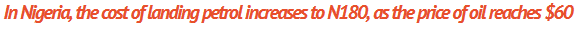The Punch reported that on the back of the rise in global oil prices, the landing costs of Premium Motor Spirit (petrol) imported into the country have increased by 13.34 percent in one month to around N180 per litre. Last Friday, from $480.25 per MT (N139.67 per litre) on January 7, the rising price of crude oil raised the cost of petrol quoted on Platts to $543.25 per metric tonne (N157.99 per litre, using N390/$1)