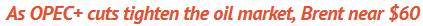 Brent Crude prices are close to $60 a barrel, a one-year high, powered mainly by OPEC+ cuts that are expected to hold this year's oil market in deficit.