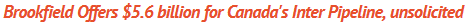 Reuters reported on Wednesday, that Brookfield Partners with Infrastructure L.P. confirmed an unsolicited C$7.08 billion ($5.6 billion) bid to acquire Canada's Inter Pipeline Ltd as it tries to gain from rebounding demand for oil and gas was rebuffed after an approach last year.